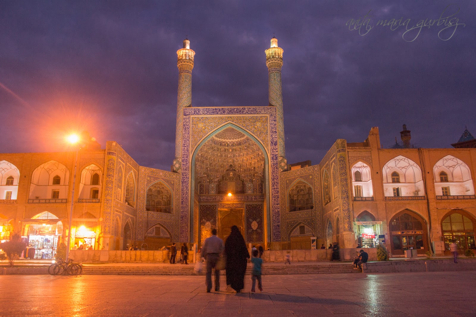 Następnego dnia rano wyruszamy w dalszą podróż do Isfahanu. Jazda mija szybko pomimo, że to ponad 200 km. Tradycyjnie spotykamy nie kogo innego jak Polaków, a żeby było nam milej dostajemy w autokarze poczęstunek. Jadąc do Isfahanu już kontaktujemy się z nowym hostem, jednak okazuje się że nie może nas przygarnąć. W zamian szuka zastępstwa. Z Hamidem spotykamy się na głównym placu, który niegdyś służył za pole golfowe, a teraz jest uroczym miejscem spotkań, z fontannami, niewielkim ogrodem. Dookoła oprócz 3 ważnych meczetów znajdują się urocze sklepiki, warsztaty gdzie podglądamy jak zrobić metalowe tace, cukierniczkę, wazon z czego słynie Isfahan. Pierwszą podpowiedz jaką dostajemy to to że meczety są otwierane o 18.00 na modlitwę, więc nie koniecznie musimy płacić za wejście jeśli poczekamy do wieczora. W takim wypadku zwiedzanie zaczynamy od przespacerowania się po placu Imama Chomeiniego (każdy największy plac w mieście nosi jego imię co nieco upraszcza sprawę). Zajmuje nam to trochę czasu, jako że jest jednym z największych placów miejskich na świecie. Dużo ludzi piknikuje, gra w piłkę, inni robią zakupy gdyż północna brama prowadzi do głównego bazaru.